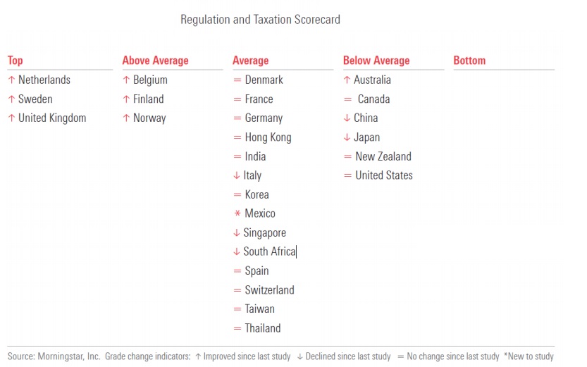 น.ส.ชญานี กล่าวว่า จากผลการศึกษามอร์นิ่งสตาร์ให้คะแนนระดับสูงสุด (Top) แก่ประเทศเนเธอร์แลนด์ สวีเดน และสหราชอาณาจักร แสดงถึงการมีกฎเกณฑ์และการจัดเก็บภาษีที่เป็นมิตรกับตลาด และให้คะแนนระดับต่ำกว่าค่าเฉลี่ย (Below Average) ให้แก่ประเทศออสเตรเลีย แคนาดา จีน ญี่ปุ่น นิวชีแลนด์ และสหรัฐอเมริกา เนื่องจากยังต้องปรับปรุงระเบียบแบบแผนในด้านกฎเกณฑ์และภาษี โดยมอร์นิ่งสตาร์ไม่ได้ให้คะแนนระดับ Bottom ในตลาดใด เนื่องจากในทุกตลาดมีมาตรการเพื่อปกป้องคุ้มครองนักลงทุน