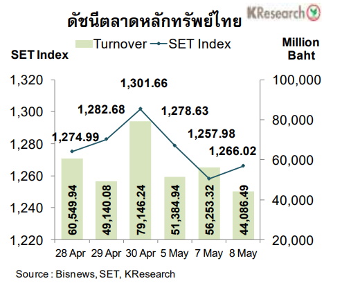 ส่วนความเคลื่อนไหวของตลาดหุ้นไทย หุ้นไทยหลุดระดับ 1,300 จุดอีกครั้ง โดยดัชนี SET ปิดที่ระดับ 1,266.02 จุด ลดลง 2.74% จากสัปดาห์ก่อน ขณะที่มูลค่าการซื้อขายเฉลี่ยต่อวันอยู่ที่ 50,574.92 ล้านบาท ลดลง 15.15% จากสัปดาห์ก่อน ส่วนดัชนี mai ลดลง 0.91% จากสัปดาห์ก่อน มาปิดที่ 253.86 จุด
