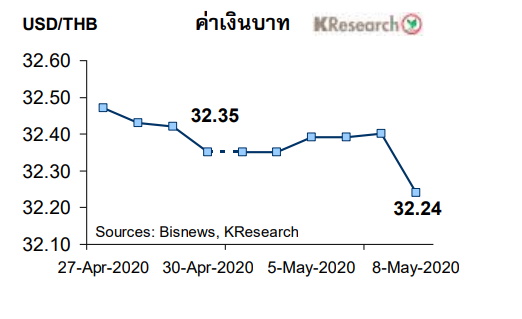 สำหรับสัปดาห์ถัดไป (11-15 พ.ค.) ธนาคารกสิกรไทยประเมินกรอบการเคลื่อนไหวของเงินบาทที่ 32.00-32.40 บาทต่อดอลลาร์ฯ โดยปัจจัยสำคัญที่ต้องติดตาม ได้แก่ สถานการณ์ภายหลังการเปิดเศรษฐกิจทั้งในและต่างประเทศ ขณะที่ตัวเลขเศรษฐกิจสหรัฐฯ ที่สำคัญ ได้แก่ ดัชนีราคาผู้บริโภค ดัชนีราคาผู้ผลิต ดัชนีราคานำเข้า/ส่งออก ยอดค้าปลีก ผลผลิตภาคอุตสาหกรรมเดือนเม.ย. ผลสำรวจกิจกรรมการผลิตของเฟดสาขานิวยอร์ก ดัชนีความเชื่อมั่นผู้บริโภค (เบื้องต้น) เดือนพ.ค. และจำนวนผู้ขอรับสวัสดิการว่างงานรายสัปดาห์ นอกจากนี้ตลาดอาจรอติดตามประเด็นทางการค้าระหว่างสหรัฐฯ และจีน ตลอดจนข้อมูลเศรษฐกิจเดือนเม.ย. ของจีนด้วยเช่นกัน