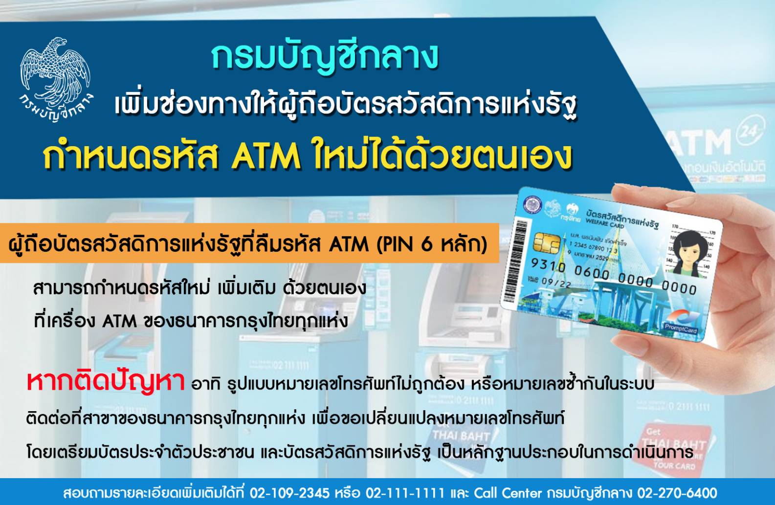 กรมบัญชีกลางประสานกับธนาคารกรุงไทย เพื่อเพิ่มช่องทางการกำหนดรหัส ATM (PIN 6 หลัก) ใหม่ เพิ่มเติม สำหรับผู้ถือบัตรสวัสดิการแห่งรัฐที่ลืมรหัส โดยสามารถดำเนินการกำหนดรหัสใหม่ได้ที่เครื่อง ATM ของธนาคารกรุงไทยทุกแห่ง