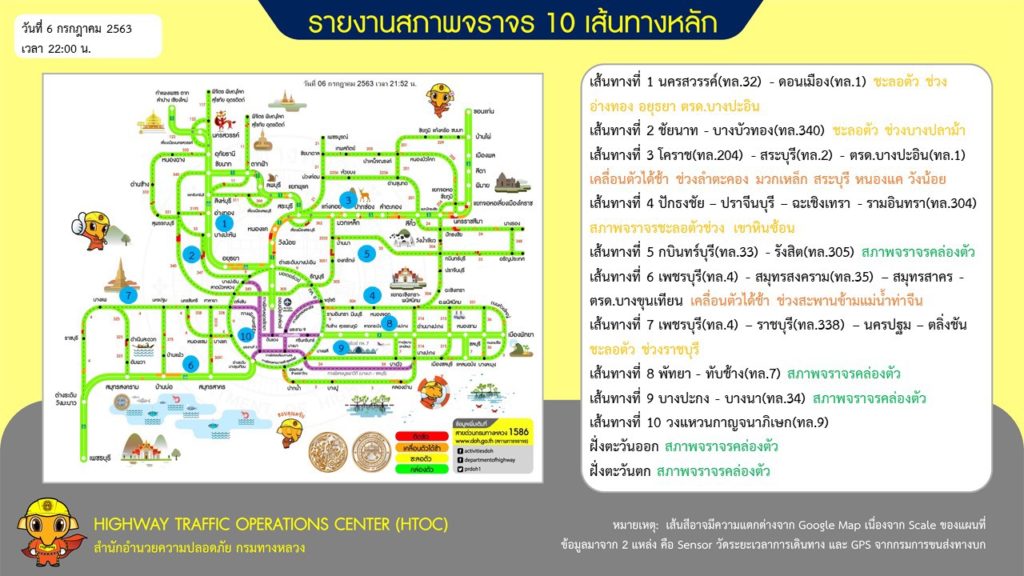 ผู้สื่อข่าวรายงานว่า กรมทางหลวงรายงานสภาพการจราจรวันที่ 6 ก.ค.2563 เวลา 22.00 น. บนทางหลวง 10 เส้นทางหลักเข้าออกกรุงเทพฯ และปริมณฑล เช่น สายเอเชีย พระราม2 โดยรวมชะลอตัว คาดว่าวันที่ 7 ก.ค.ซึ่งเป็นวันหยุดวันสุดท้ายปริมาณการจราจรจะหนาแน่นมาก