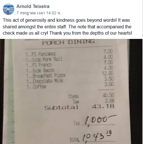 แต่ให้ค่าทิป 1,000 ดอลลาร์ หรือราว 32,000 บาท