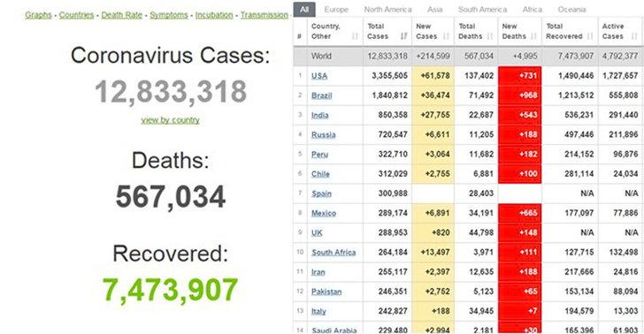 เว็บไชต์ Worldometers รายงานสถานการณ์โรคโควิด-19 ประจำวันที่ 12 กรกฎาคม 2563 ช่วงเวลาประมาณ 07.30 น. ตามเวลาประเทศไทย ทั่วโลกพบมีผู้ป่วยติดเชื้อแล้ว 12,833,318 ราย เพิ่มขึ้น 214,599 ราย เสียชีวิต 567,034 ราย เพิ่มขึ้น 4,995 ราย รักษาหายแล้ว 7,473,907 ราย