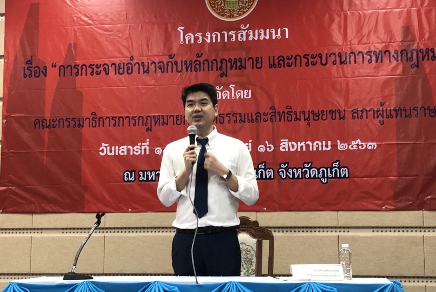 เมื่อวันที่ 15 สิงหาคม ที่ห้องประชุมคุณหญิงกาญจนา ณ ระนอง ศูนย์ประชุมอันดามันพรรณราย มหาวิทยาลัยราชภัฏภูเก็ต ได้มีการจัดสัมมนาเรื่อง “การกระจายอำนาจกับหลักกฎหมาย และกระบวนการทางกฎหมาย” ของคณะกรรมาธิการการกฎหมายและการยุติธรรมและสิทธมนุษยชน สภาผู้แทนราษฎร มีนายพิเชษฐ์ ปาณะพงศ์ รองผู้ว่าราชการจังหวัดภูเก็ต กล่าวต้อนรับ นอกจากนี้ ยังมีบุคคลสำคัญเข้าร่วม อาทิ นายรังสิมันต์ โรม โฆษกคณะกรรมาธิการ และนายปิยบุตร แสงกนกกุล ที่ปรึกษาประจำคณะกรรมาธิการ รวมถึงภาครัฐ องค์กรปกครองส่วนท้องถิ่น เอกชน อาจารย์ นักศึกษา และภาคประชาชนร่วมสัมมนา