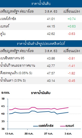 + ราคาน้ำมันดิบเวสต์เท็กซัสและเบรนท์ปรับตัวเพิ่มขึ้น โดยได้รับแรงหนุนจากความหวังในการฟื้นตัวของเศรษฐกิจโลก หลังกิจกรรมภาคการผลิตของสหรัฐฯ ปรับตัวเพิ่มขึ้นไปแตะระดับ 54.2 ในเดือนก.ค. 63 ซึ่งเป็นระดับสูงสุดในรอบ 1 ปี โดยเป็นผลมาจากคำสั่งซื้อที่เริ่มฟื้นตัว นอกจากนี้ กิจกรรมทางเศรษฐกิจของกลุ่มประเทศยุโรปได้ขึ้นมาอยู่ในระดับเติบโตเป็นครั้งแรกนับตั้งแต่ต้นปี 2562