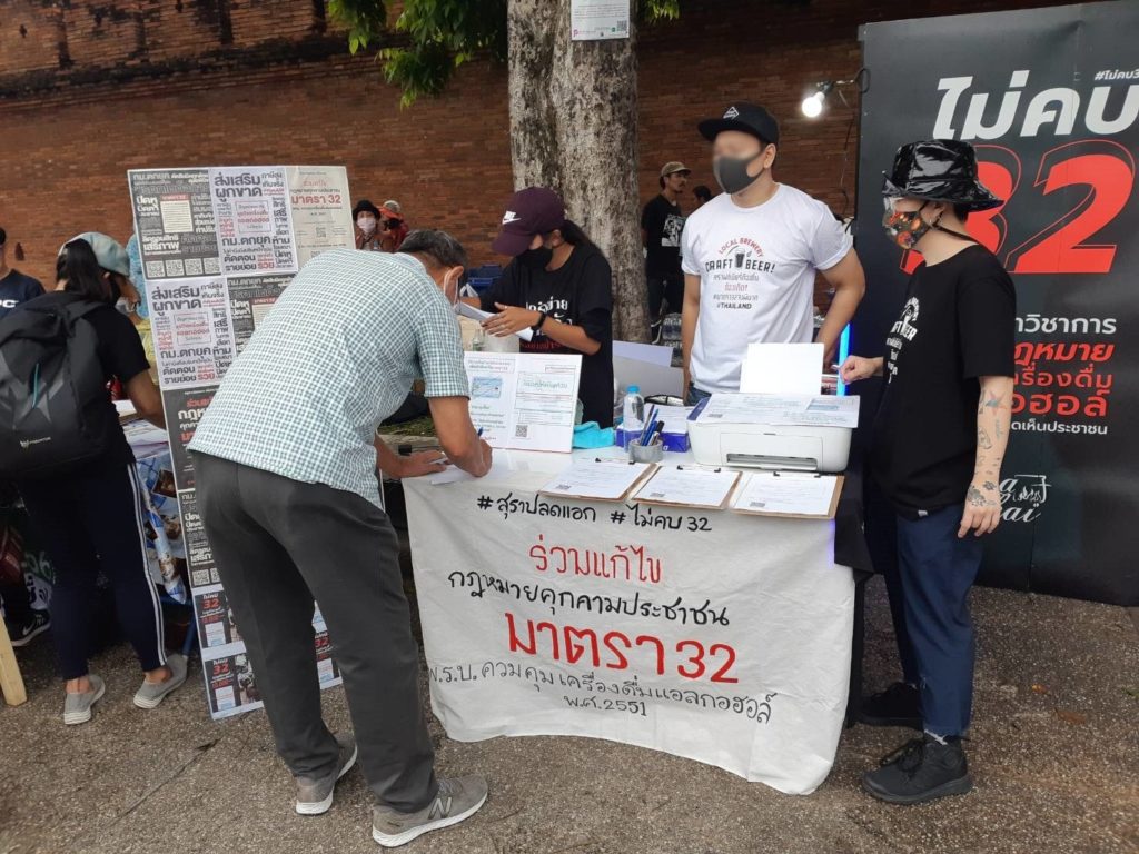 ต่อมาเวลา 16.30 น. กลุ่มผู้จัดกิจกรรม ได้เปิดให้ผู้ร่วมชุมนุมได้ลงรายชื่อเพื่อร่วมแก้ไขกฎหมายคุกคามประชาชน ตาม ม.32 ของรัฐธรรมนูญ พร้อมแก้กฎหมายการผูกขาดจำหน่ายแอลกอฮอล์ เพื่อคุ้มครองผู้บริโภค และร่วมปลดปล่อยนักศึกษา นักวิชาการ ประชาชน และนักเคลื่อนไหวทางการเมือง จำนวน 31 ราย ที่ถูกดำเนินคดีทางการเมือง โดยมีผู้ลงรายชื่อจำนวนมาก ก่อนเปิดให้ผู้ร่วมชุมนุมได้รับประทานอาหาร ของว่าง น้ำดื่ม และปลาเผา จำนวน 50 ตัวฟรี พร้อมเปิดรับบริจาคเพื่อสนับสนุนกิจกรรมดังกล่าว