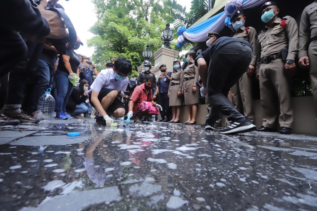 ผู้ชุมนุมได้นำอุปกรณ์มาเพื่อทำความสะอาดบริเวณพื้นและป้ายสำนักงานตำรวจแห่งชาติ แต่เจ้าหน้าที่หลายสิบนายได้ออกมายืนกั้นเป็นแนวหน้ากระดาน ทำให้ผู้ชุมนุมไม่สามารถทำความสะอาดป้ายสำนักงานฯ ได้